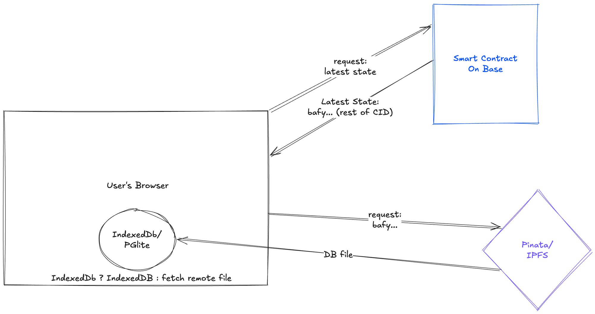 In this post, we’ll go over a rough proposal, which I’m calling “IPDB” or “InterPlanetary Database.” Keep in mind that while this is not a perfect solution for every use case, it is an interesting path we could see more of in the future. Companies like ElectricSQL who are developing PGlite and pushing a model where databases are local first and then sync to a remote database through a sync engine. If you take this model and find a way to create a distributed sync engine, then you have a really unique solution for the Web3 ecosystem!