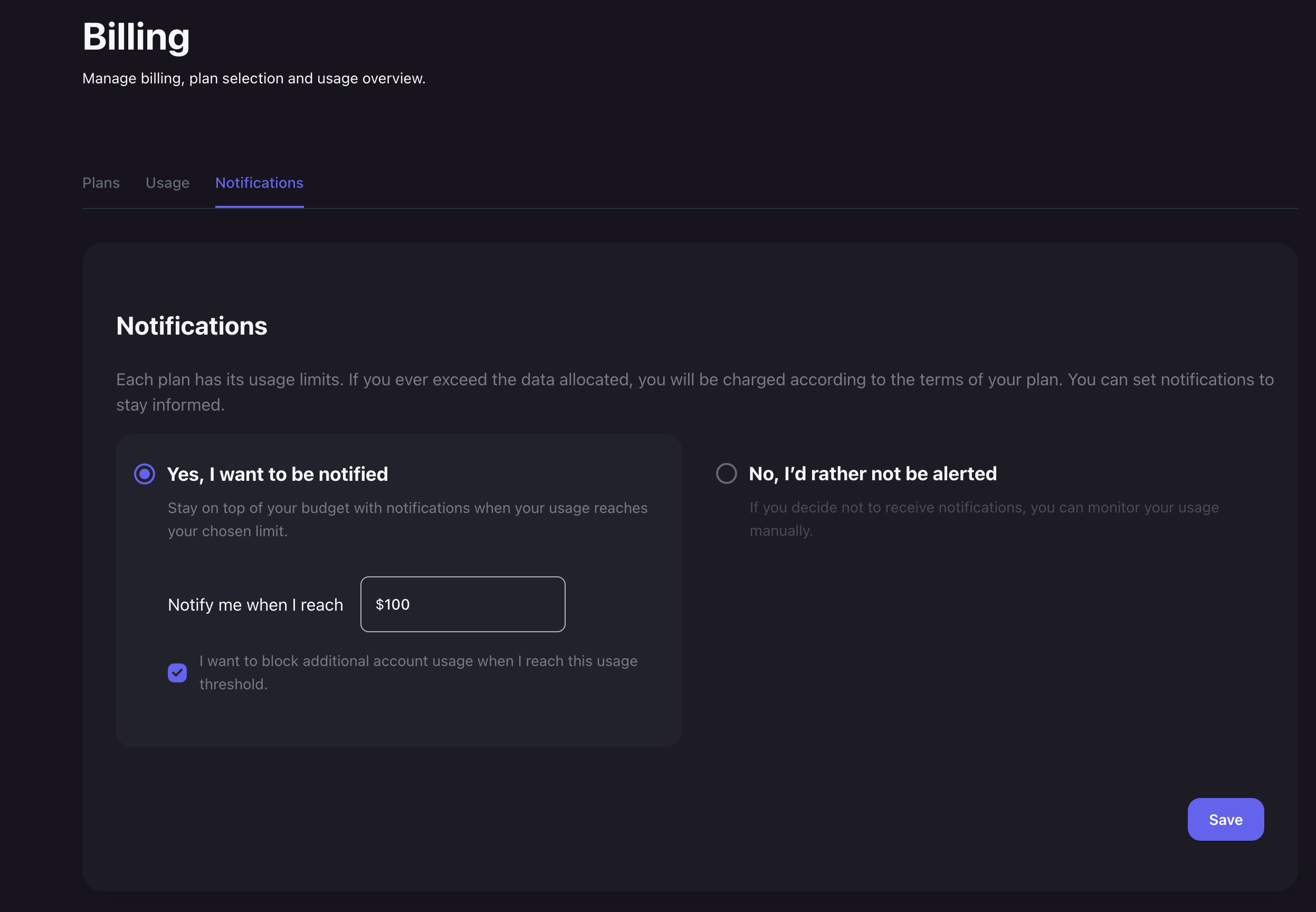 From the billing page, you can access the Notifications tab and configure your usage settings. Rather than forcing you to choose which specific usage item (storage, bandwidth, etc) to monitor, we allow you to pass in a dollar total. If you don’t want to spend a penny above your normal monthly fee, put your monthly plan total in and check the box that says you want to block additional usage. If you’d prefer to be notified, you can leave that checkbox unchecked and we’ll send you an email when you’ve reached the dollar threshold set.