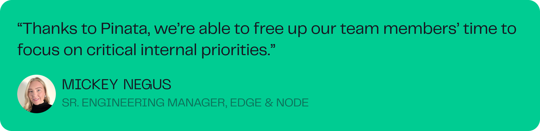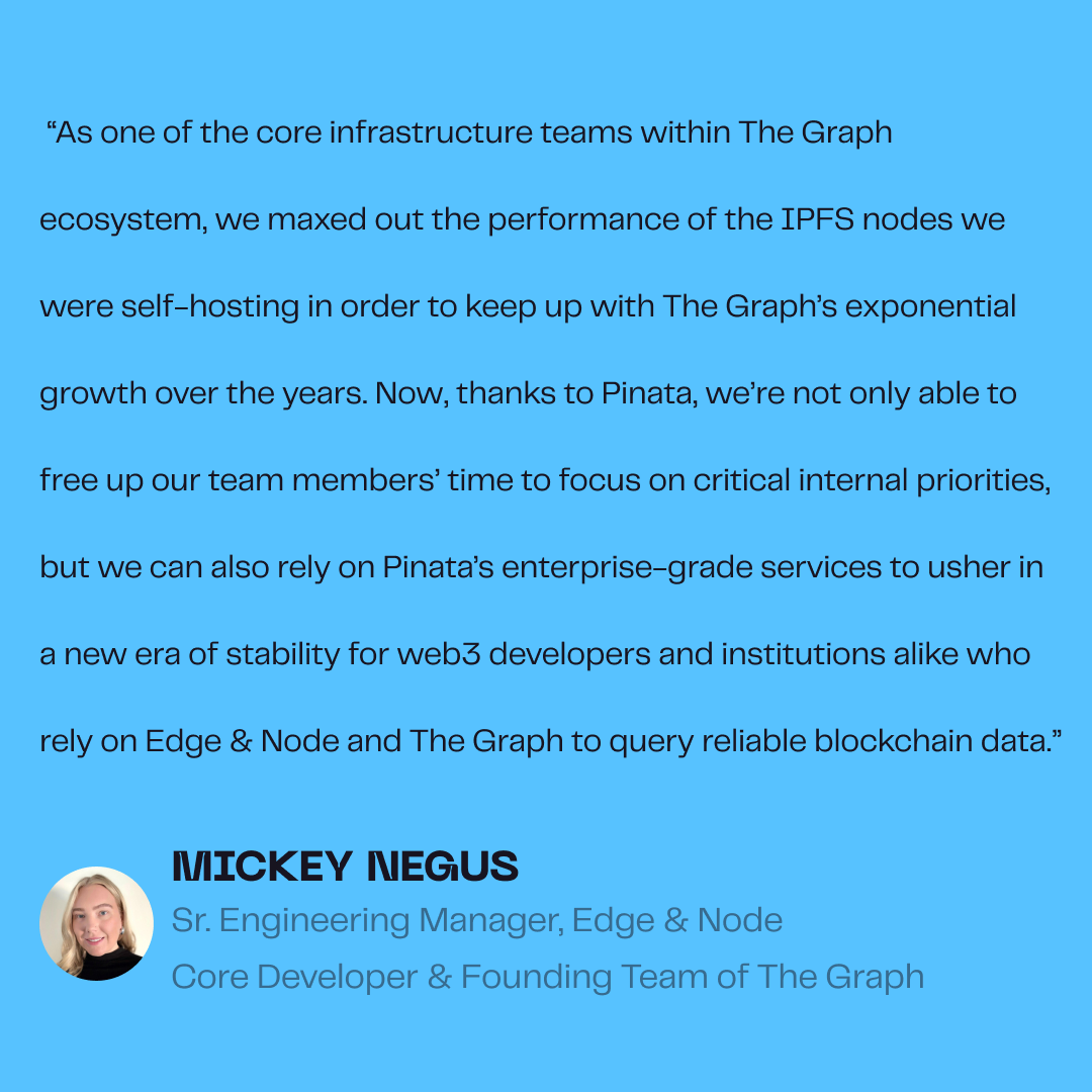 - Pinata’s support extended far beyond standard service. Our engineers worked directly with Edge & Node’s team to analyze traffic patterns, fine-tune caching, and implement smarter rate-limiting strategies, ensuring long-term resilience and efficiency.