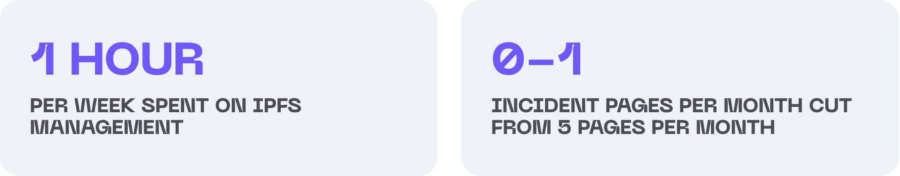 But managing their own IPFS instance came with growing complexity. The team was spending valuable engineering hours maintaining infrastructure instead of advancing core products. As The Graph expanded, the Edge & Node team was hitting performance limitations for what IPFS could handle in its current implementation.