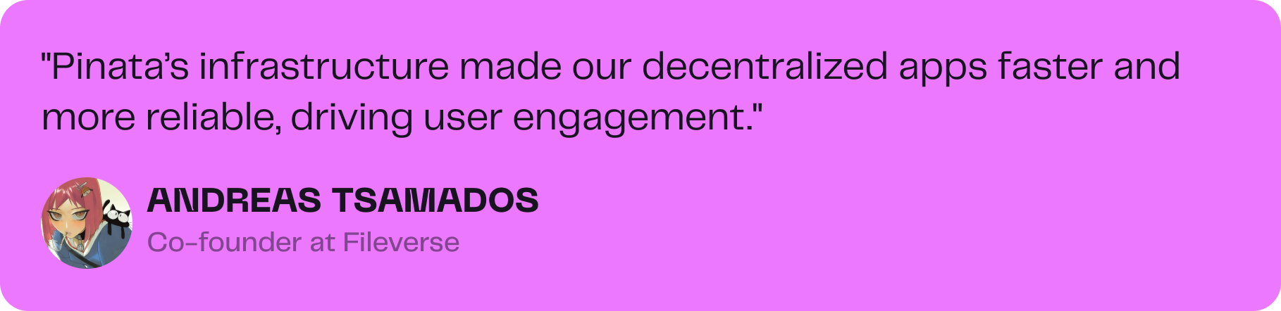 With Pinata’s reliable content delivery system, Fileverse was able to enhance user access speeds and create a smoother collaboration experience, all while preserving its decentralized architecture. Pinata’s IPFS gateway provided faster, more reliable content delivery and enhanced the performance of Fileverse’s applications.