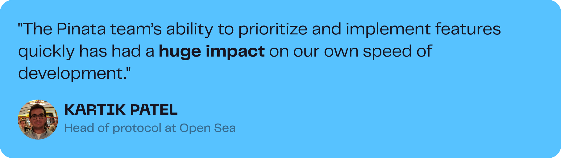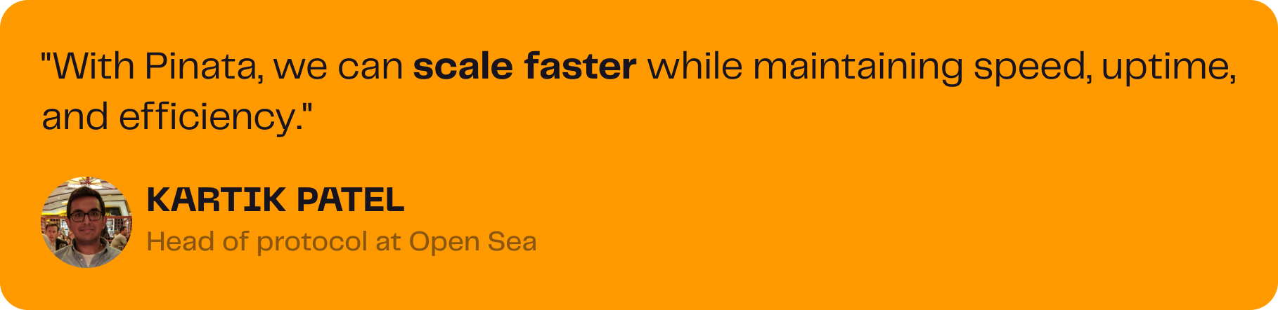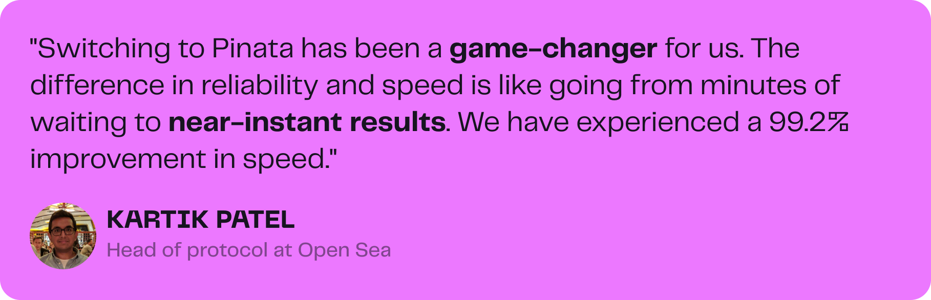 When Kartik found Pinata, he knew he had followed the right path. With Pinata’s APIs and Gateways, OpenSea got a faster, more reliable way to handle metadata updates — right when their users needed it most.