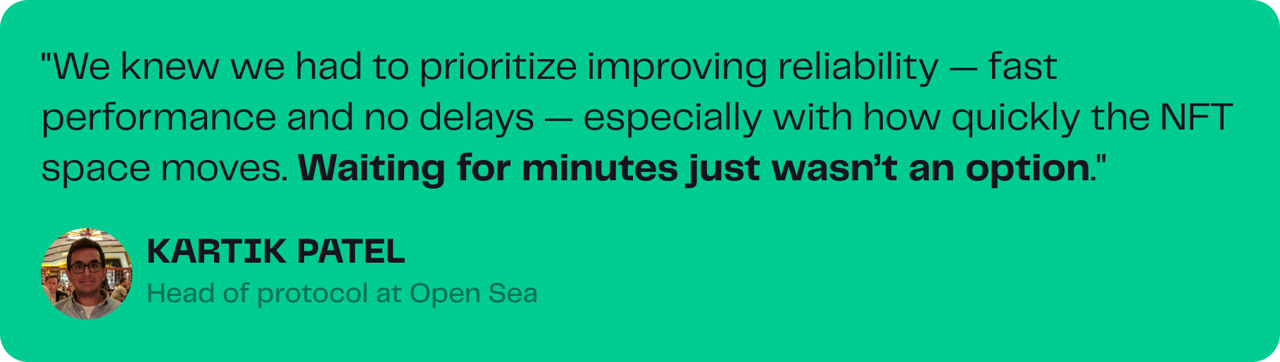 For Kartik Patel, Head of Protocol at OpenSea, this was not an imaginary scenario. OpenSea was gaining users in droves, and they needed the reliability, scalability, and fluid user experience expected of the world’s leading NFT marketplace. However, the team faced a hurdle: their IPFS (InterPlanetary File System) gateways simply couldn’t keep up with the company’s growing user demand. This led to inconsistencies when fetching metadata and frustrating delays when minting NFTs and unveiling new collections.
