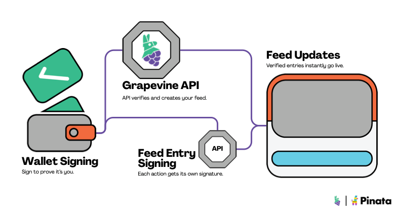 Wallets are the users of Grapevine and are classified as the "owner" of a feed upon feed creation. In order to post entries to that data feed, a wallet must sign a signature proving they were the owner of that data feed. This logic is the same for both our database approach, as well as the smart contract crypto native approach mentioned above.