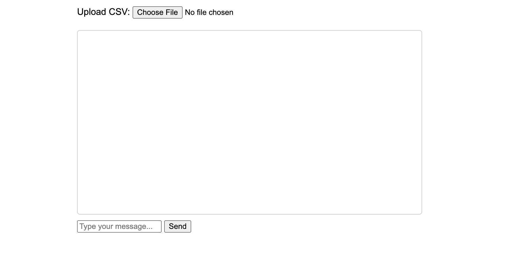 That should do it! You can now upload a CSV and chat with it. Go ahead and restart your server and give it a try. I cleaned up the CSS in my app, but functionally it should work exactly like yours does. Here’s what I have: