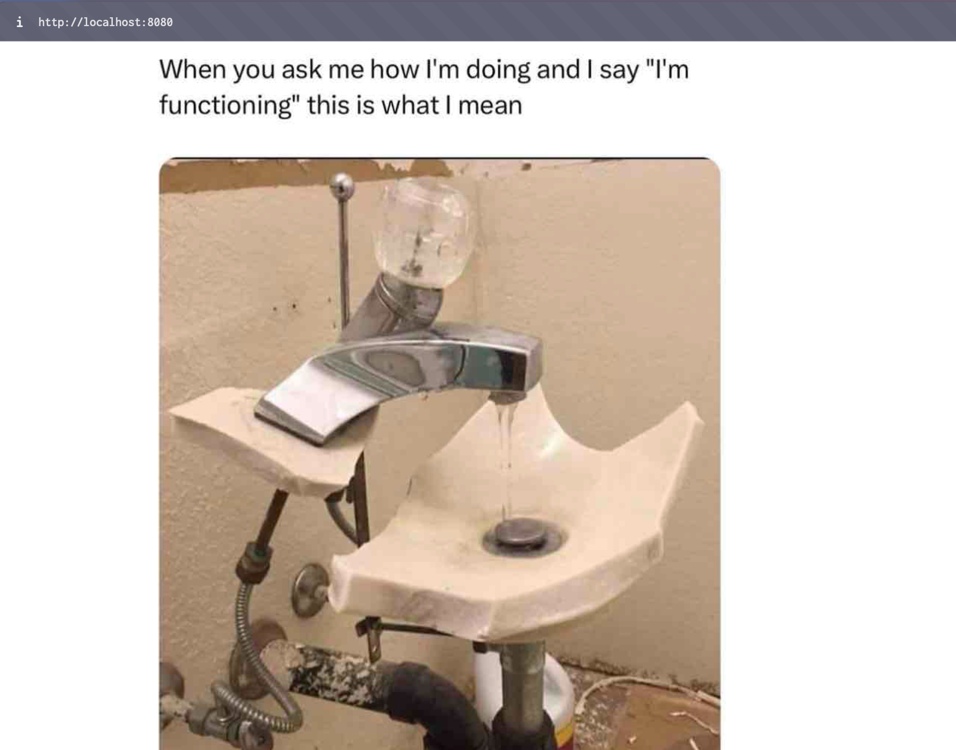 Let’s test it! Restart your server and open your browser to localhost:8080. You should see a random meme. Refresh, and you’ll get another one.