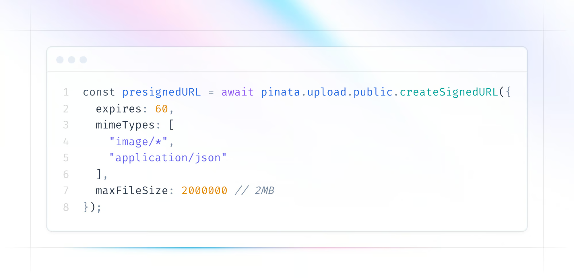 Pinata was the first IPFS provider to give developers the power and control to allow their users to upload from the frontend. This was important because it cuts down on latency and allows for larger file sizes. We improved upon this paradigm recently by introducing presigned URLs, a standard way for developers to allow uploads on the frontend by providing their users a single URL that includes verifiable signature data. But we knew, even as we worked on the first iteration of presigned URLs, that we wanted to take this further.