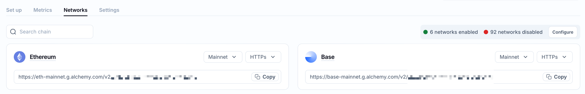When you’ve signed up for Alchemy, you’ll need to create a project, and then you will want to click on the Networks tab and copy the URL of whichever network you’re interested in.