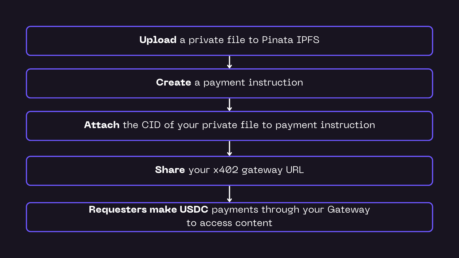 Pinata’s Private IPFS makes this possible, and Pinata’s x402 adds monetization. With Pinata’s x402, payment conditions can be attached to files stored on Private IPFS. Access is restricted until the payment conditions are met using a dedicated gateway, then payments are received directly in the creator’s wallet in USDC. This creates a direct value exchange between the creator or business, and the consumer.