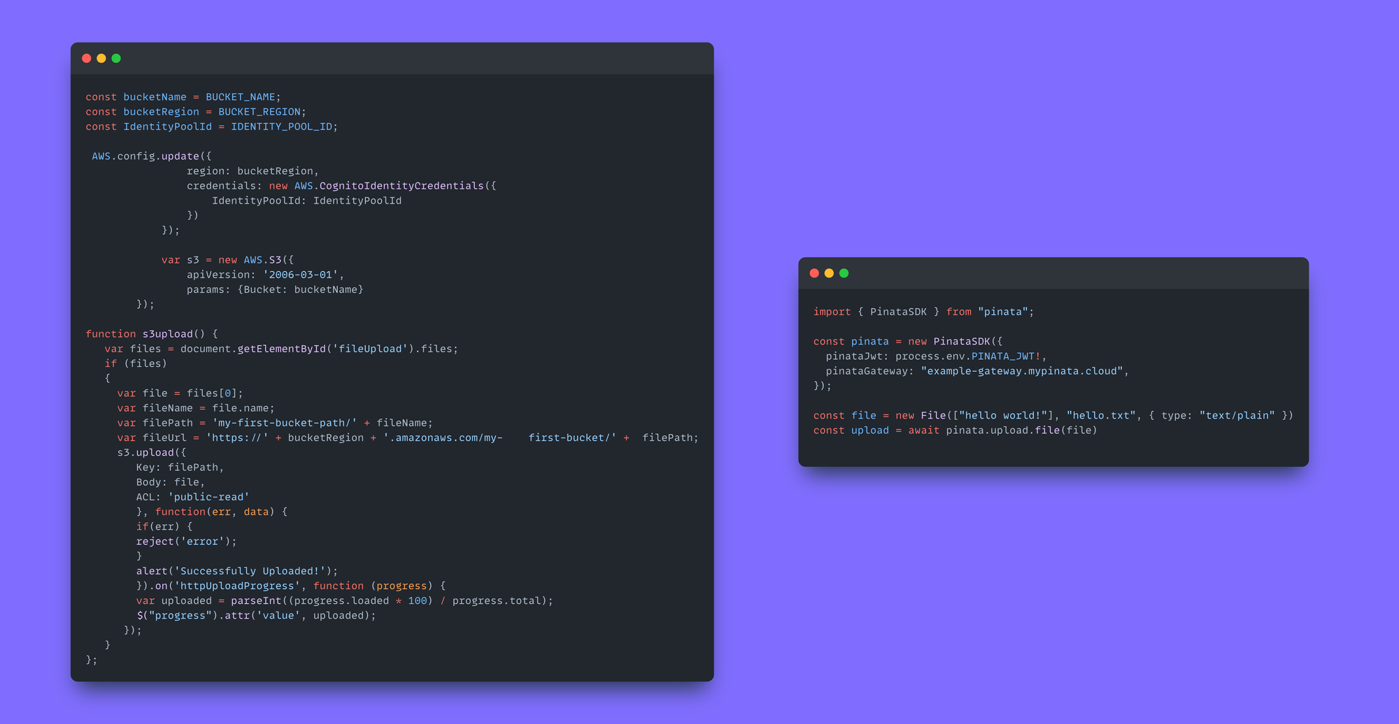 Let’s cut right to the chase and look at the complexity of S3 vs. Pinata (S3 on the left, Pinata on the right).